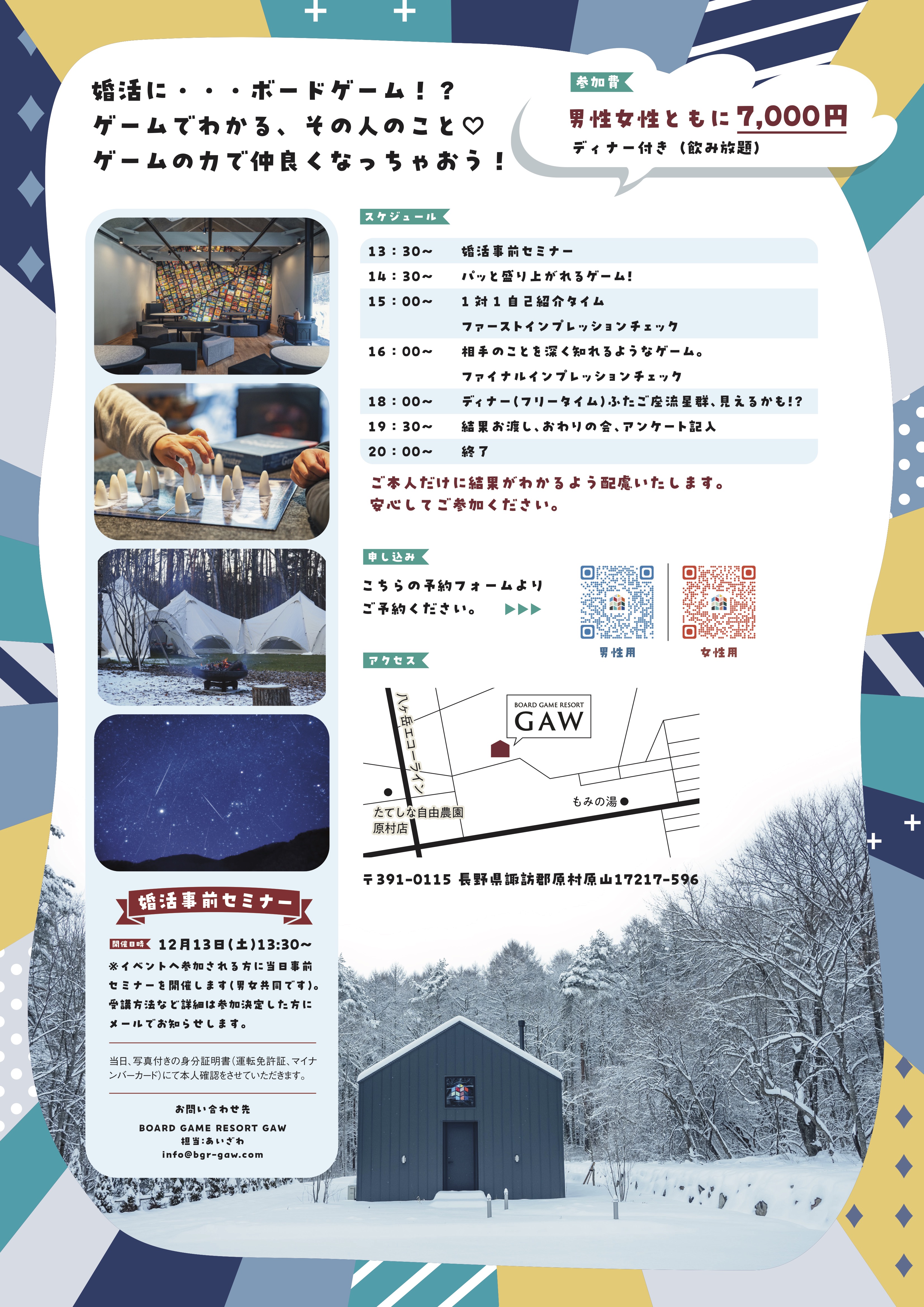 28~45歳の独身男女各15名(定員30名)※申し込み多数の場合は抽選の上、12月6日(土)までにメールでご連絡いたします。